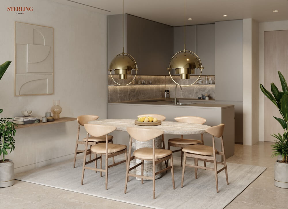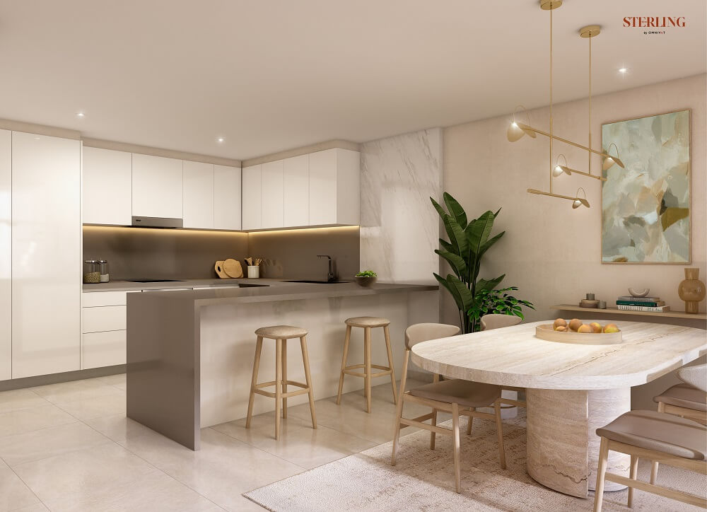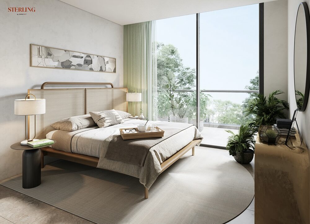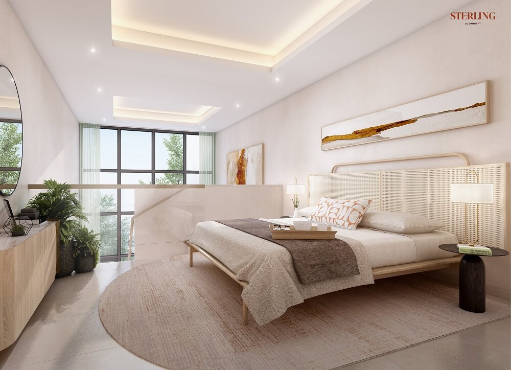 В комплексе The Sterling представлены лофты и апартаменты с видом на сад, студии, резиденции с 1-4 спальнями, пентхаусы, а также таунхаусы. В помещениях нет колонн и препятствующих конструкций, а потолки высотой 3 м и просторные окна открывают потрясающий вид на небоскреб Burj Khalifa и центр Дубая.